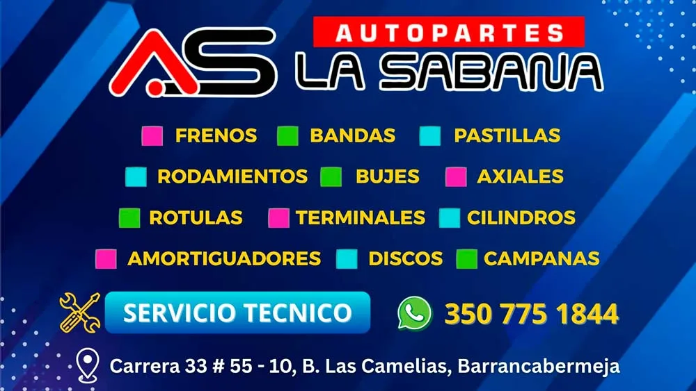 Somos una empresa Barranqueña con más de 10 años en el mercado de autopartes, ofrecemos soluciones integrales para el mantenimiento y reparación de vehículos. Nos especializamos en la venta de autopartes y repuestos automotrices, brindando a nuestros clientes productos de la más alta calidad, respaldo garantizado y precios competitivos. en Autopartes La Sabana disponemos de repuestos para motor, suspensión, frenos, transmisión, dirección, sistema eléctrico, lubricantes, accesorios y mucho más, todo con el compromiso de ofrecerte lo mejor en desempeño y durabilidad.