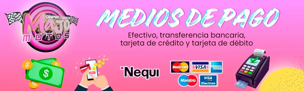 En Compraventa Majo Motos pensamos en tu comodidad por eso contamos con diferentes medios de pago para facilitar tus compras. Aceptamos efectivo, transferencias, tarjetas débito y crédito, para que elijas la opción que más te convenga.
